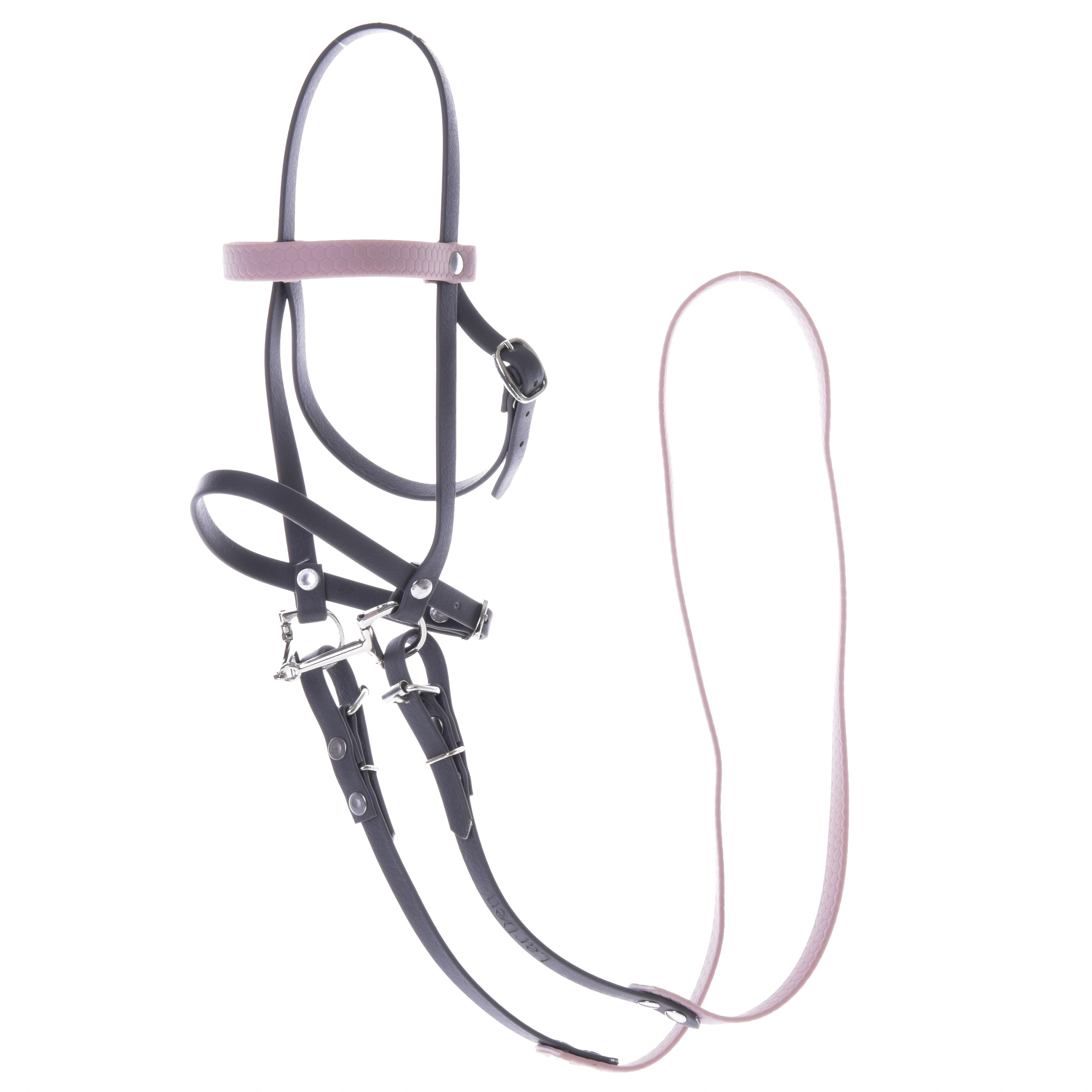 Complete leatherette bridle grey with pink headband – Hobby Horse bridle for elegance and communication