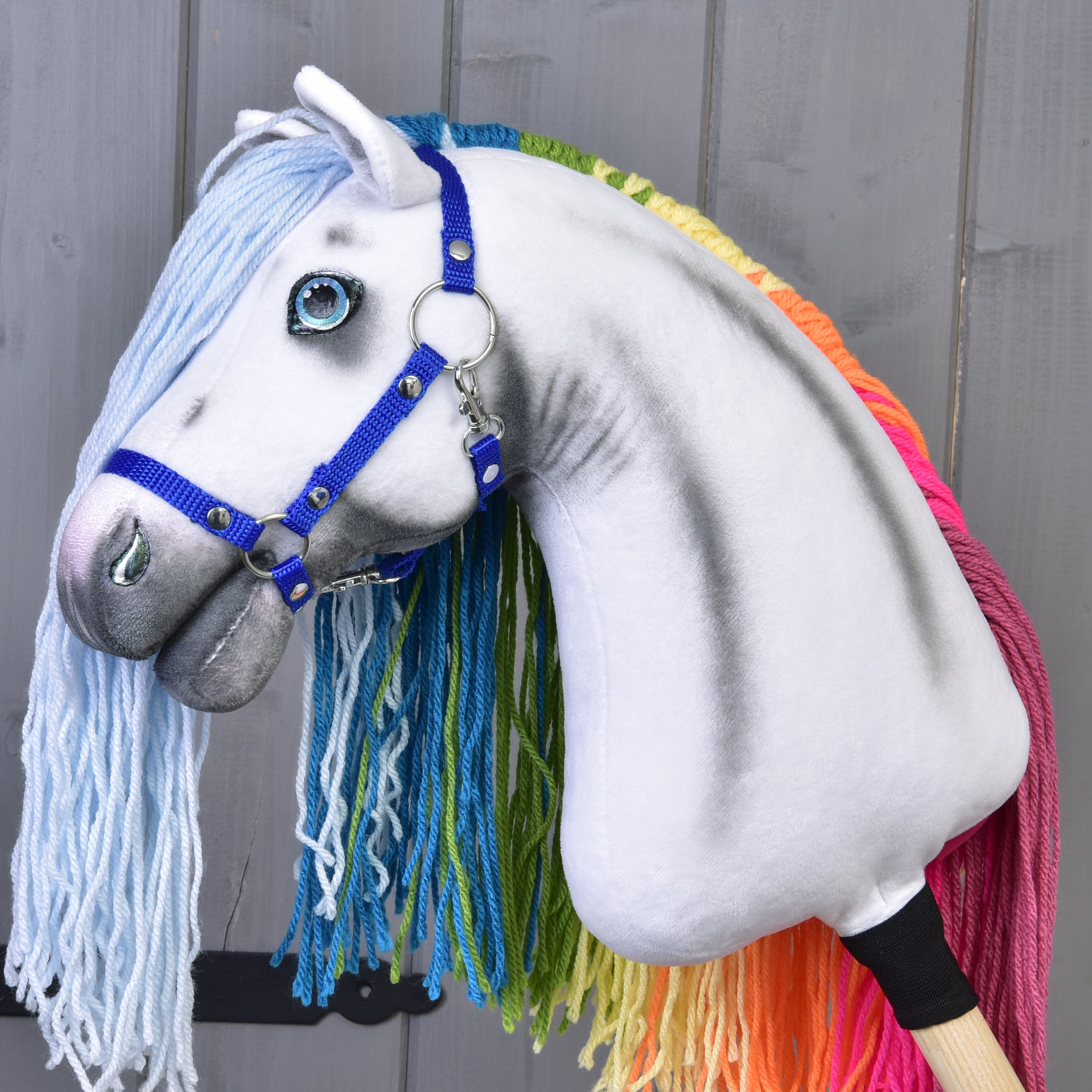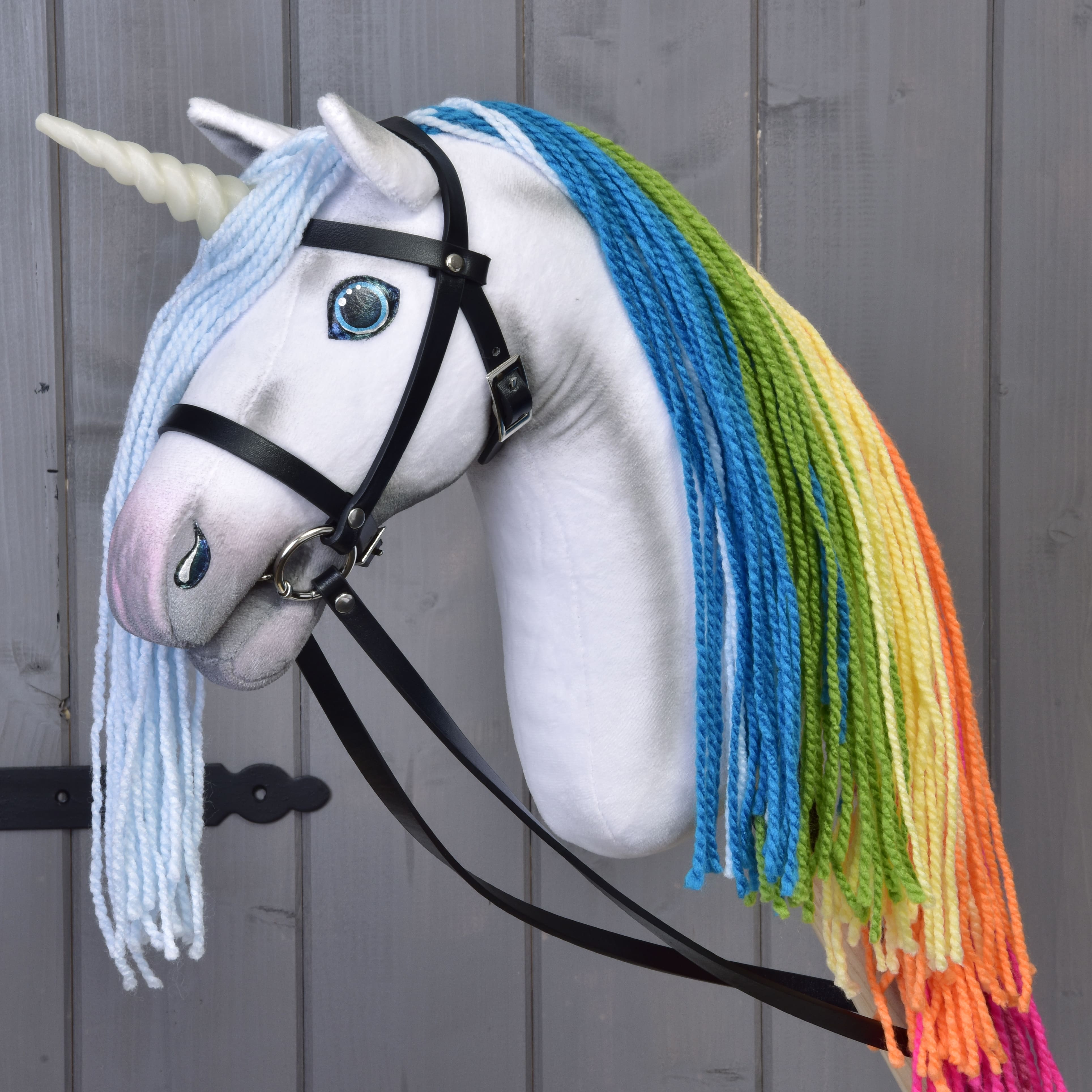 Hobby Horse Unicorn Rainbow with Bridle and Halter – Halter included with every Hobby Horse